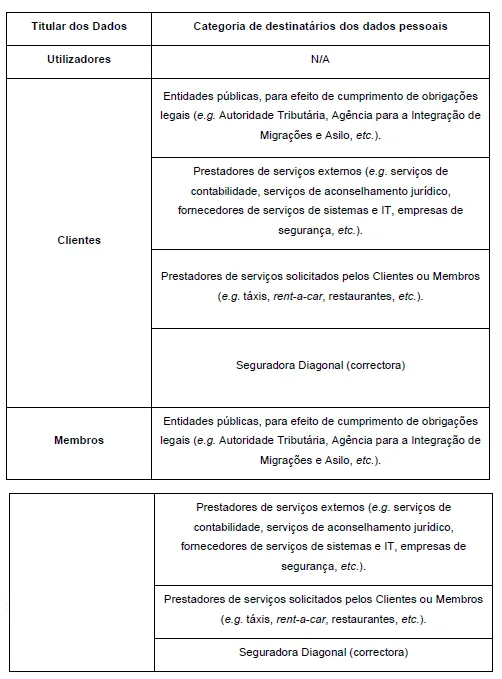 O Four Seasons Country Club poderá partilhar os seus dados pessoais, no âmbito da prossecução da sua atividade, nomeadamente, com as categorias de destinatários melhor descritas na tabela abaixo.